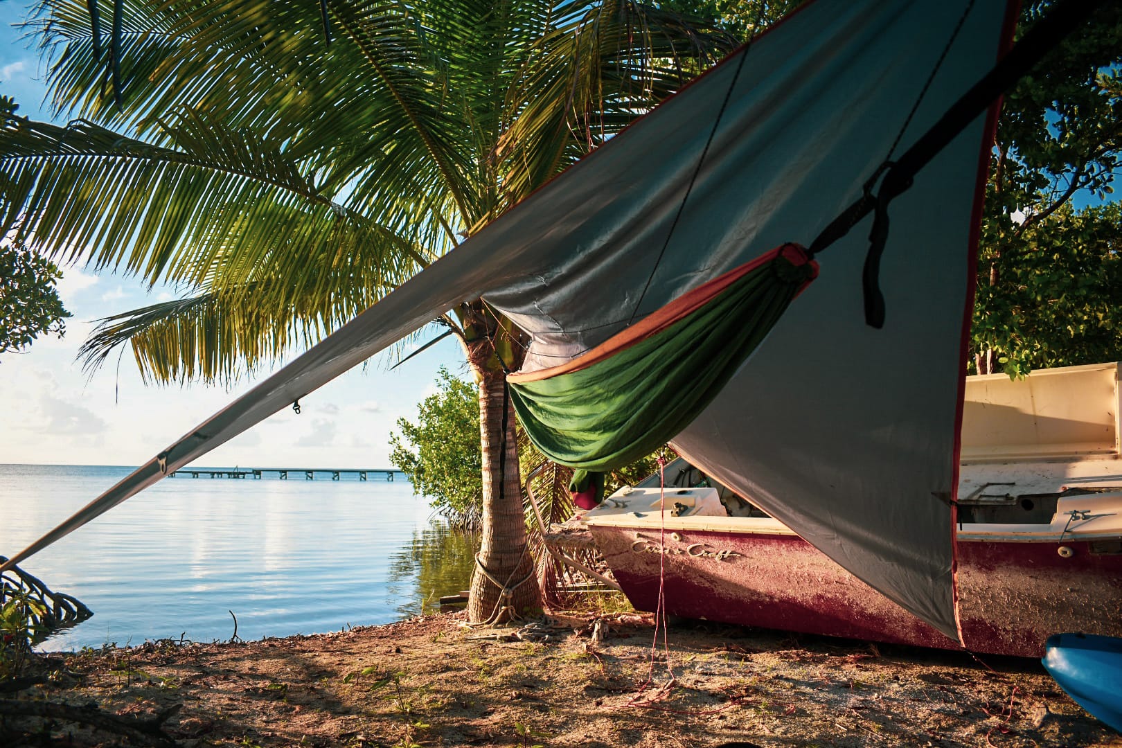 The adjacent land cut out an alcove by the shore perfect for hammock camping. A palm tree sat, skirting the ocean just above high tide, with mangroves scattered between it and the pier, and a few lone trunks stood further inland as straight as Lodgepole Pine, this was the spot I had told Kelly about the day prior. This is where we were going to camp tonight on a half-cleared lot that never quite accumulated into much of anything, down by the lone palm tree, and the abandoned boat, at the end of the gravel road.