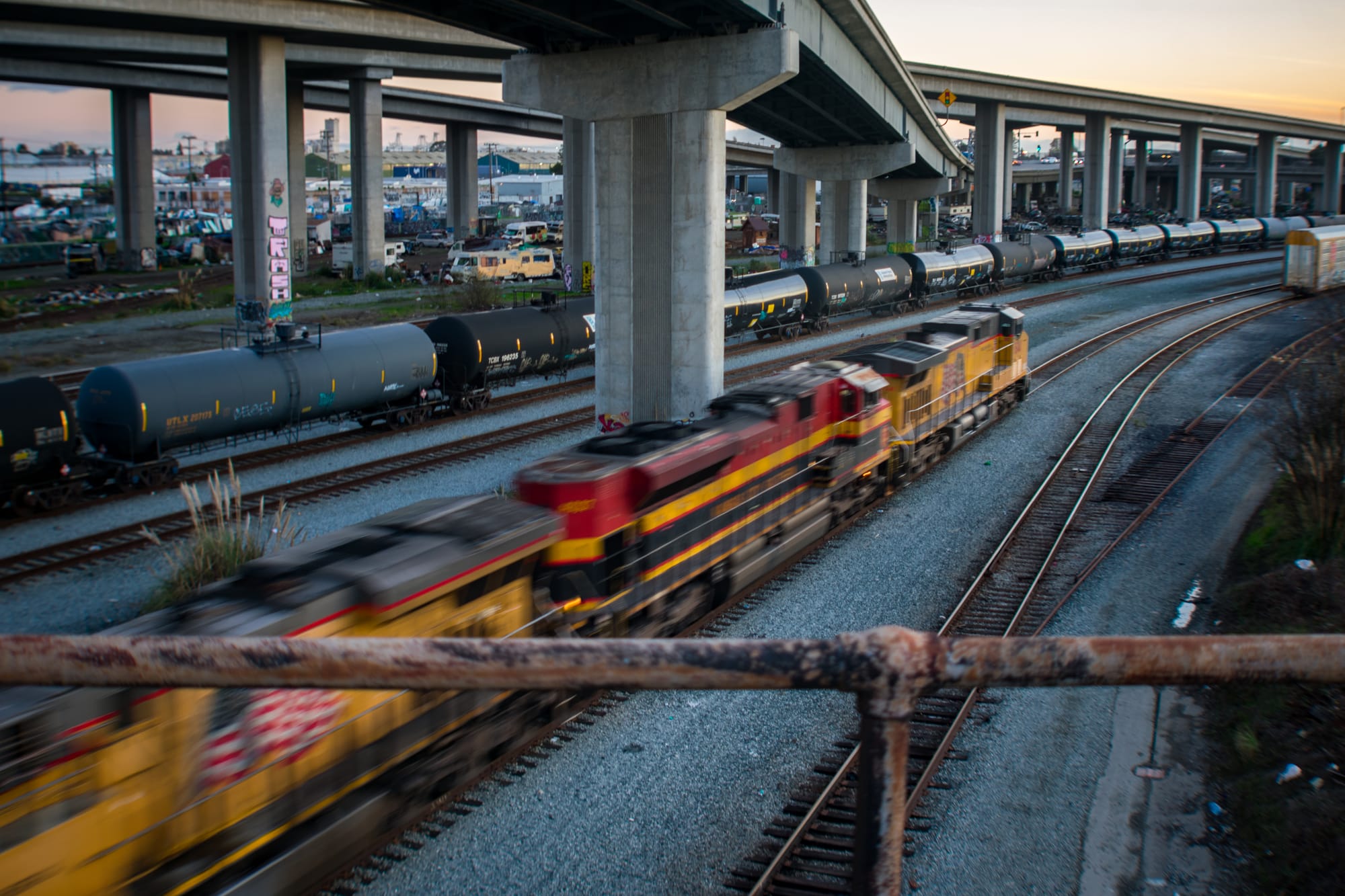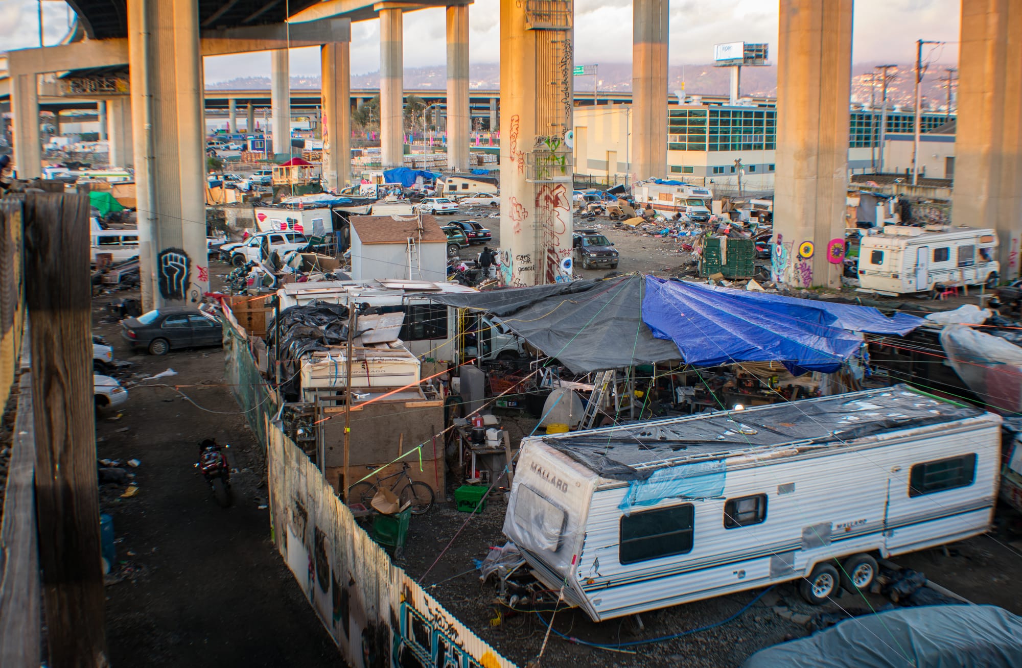 Much like the Tenderloin, Oakland shared its lawlessness to an extreme I've never seen before. Tiny homes and ramshackle shanties occupied shoulders of roadways on deadend streets. RVs and broken down busses and campers and cars and makeshift homeless camps brought a community of forgotten souls together under the overpasses and by the railroad tracks of Desert Yard. Police let the houseless live their lives in peace and didn't kick them out or make it harder for them, and for that, I respected both cities.