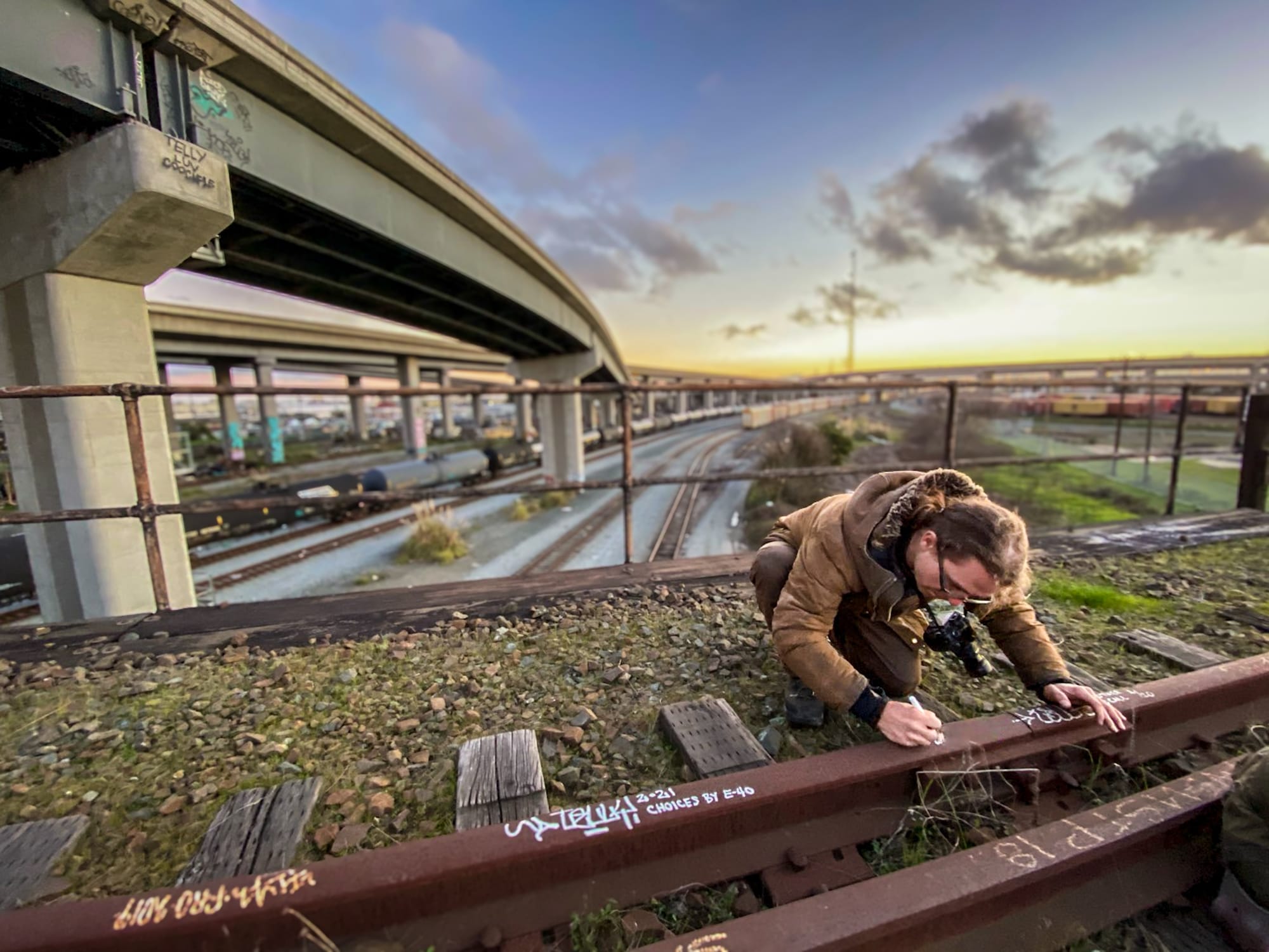 I walked the line with Ben as he painted a car seeing groups of Oakland hipsters painting loaded autoracks in broad daylight, under cameras, no gloves, no masks or respirators, leaving their cans on the tracks, standing on knuckles and crawling under cars, lacking any respect whatsoever for the train and the scene, and that's coming from an "oogle toy" who can't paint for shit; so I don't. I leave it for the creative minds and artists and writers who've earned their street cred to paint trains and racks, but Oakland Desert Yard, it was a different beast. A sight worth seeing for the lack of common sense. People racking up offenses without even realizing it.
