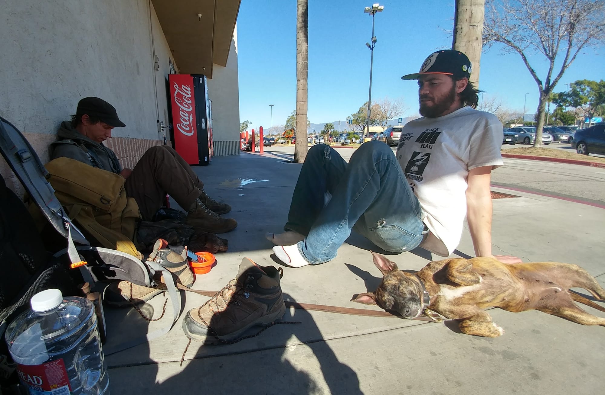 I stood up, wobbling and hungover, for a brief tramp to the Walmart, flinging my gear down on the sidewalk by the electrical outlet. One after the other, Dirty Kids approached. Dirk looked like a typical train kid wearing Carhartt pants, some holes blown out in the ass, sporting a studded, sleeveless, jean jacket covered in patches, with a grimy hoody and a newsboy cap atop his head. His greasy short black hair curled under his cap and his tanned skin reflected many days of tramping on the open road. Meeka, his little pit-mix, pranced around next to him with shiny golden-brown fur and a cute swagger. Cid on the other hand wore shorts over long johns with flaps of camouflage cloth dangling behind his ass. Under a studded and patched cap, he had a buzz-cut with a patch of long blonde hair.