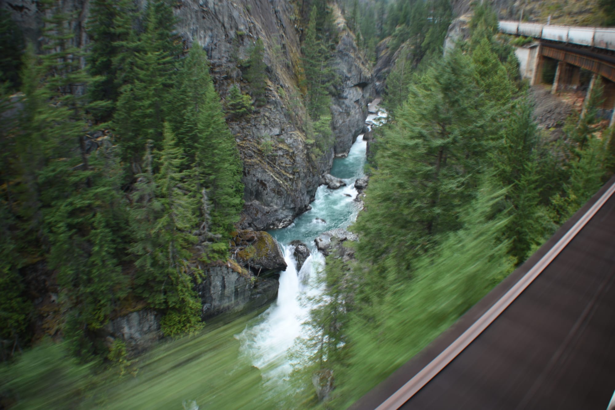 Late that evening, she whistled through chasms of bedrock, working hard to power up the steep high mountains of Garibaldi and Whistler, meandering the curves and jostling through thick, verdant forests while glacial torrents ripped through the valley below carving a path of rounded stone.