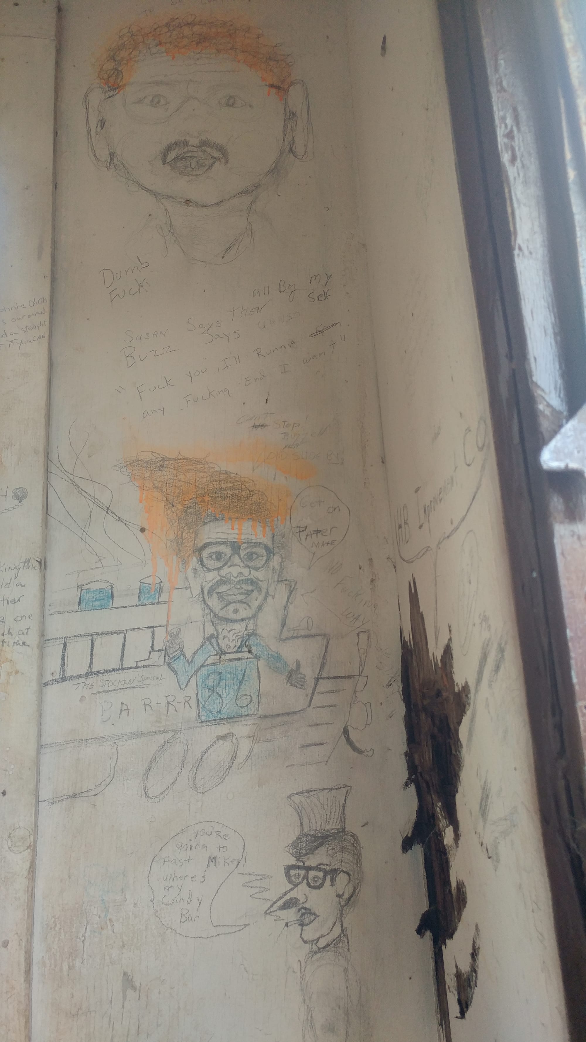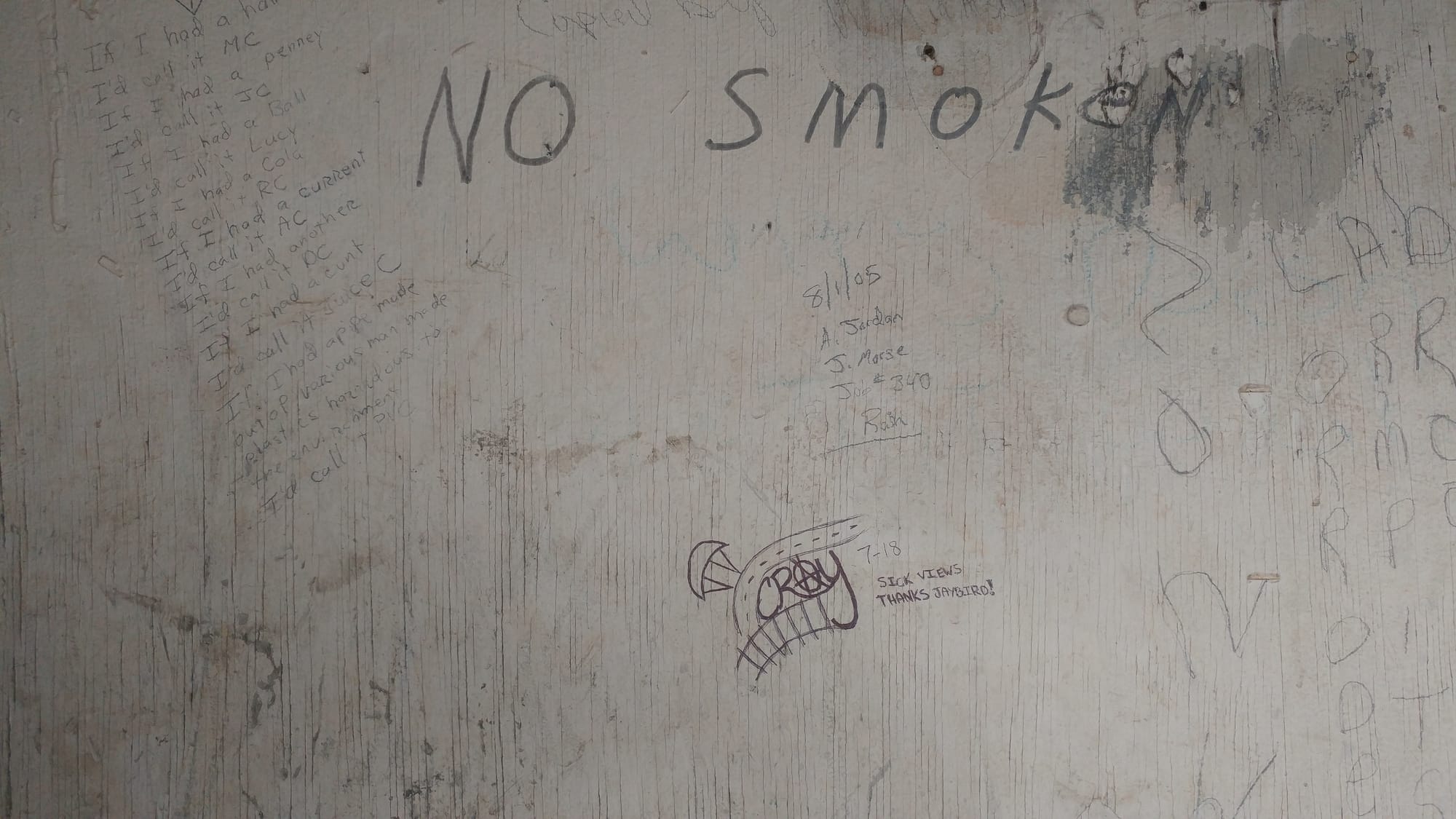 The hut stood there like a metal framed shed, with streaks of rust oxidized to its façade. Broken glass lay scattered among the dusty inside floor and wooden countertop from its windowless shell. When I stepped inside the crammed space it smelled of mildew, but the lively presence of riders evolved through the scribbling of pencils, pens, and markers etched into the off-white walls.