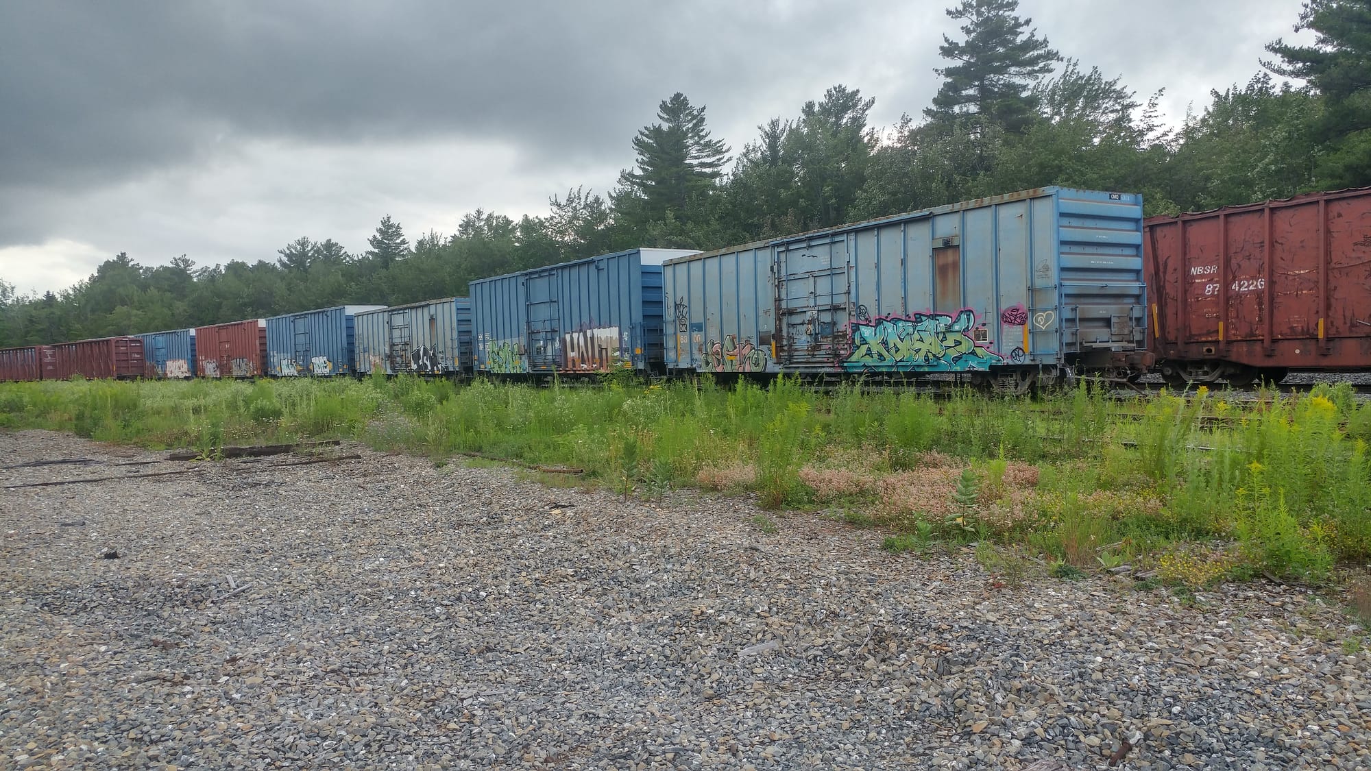 As the sky faded, beckoning thick cool air, she sided four miles from the Mattawamkeag Yard and fearing I might end up in McAdam, I hopped off and started hoofing it down the tracks. I wandered by abandoned CP boxcars, with flaky, rusted red walls and weeds growing in orifices of accumulated dirt.