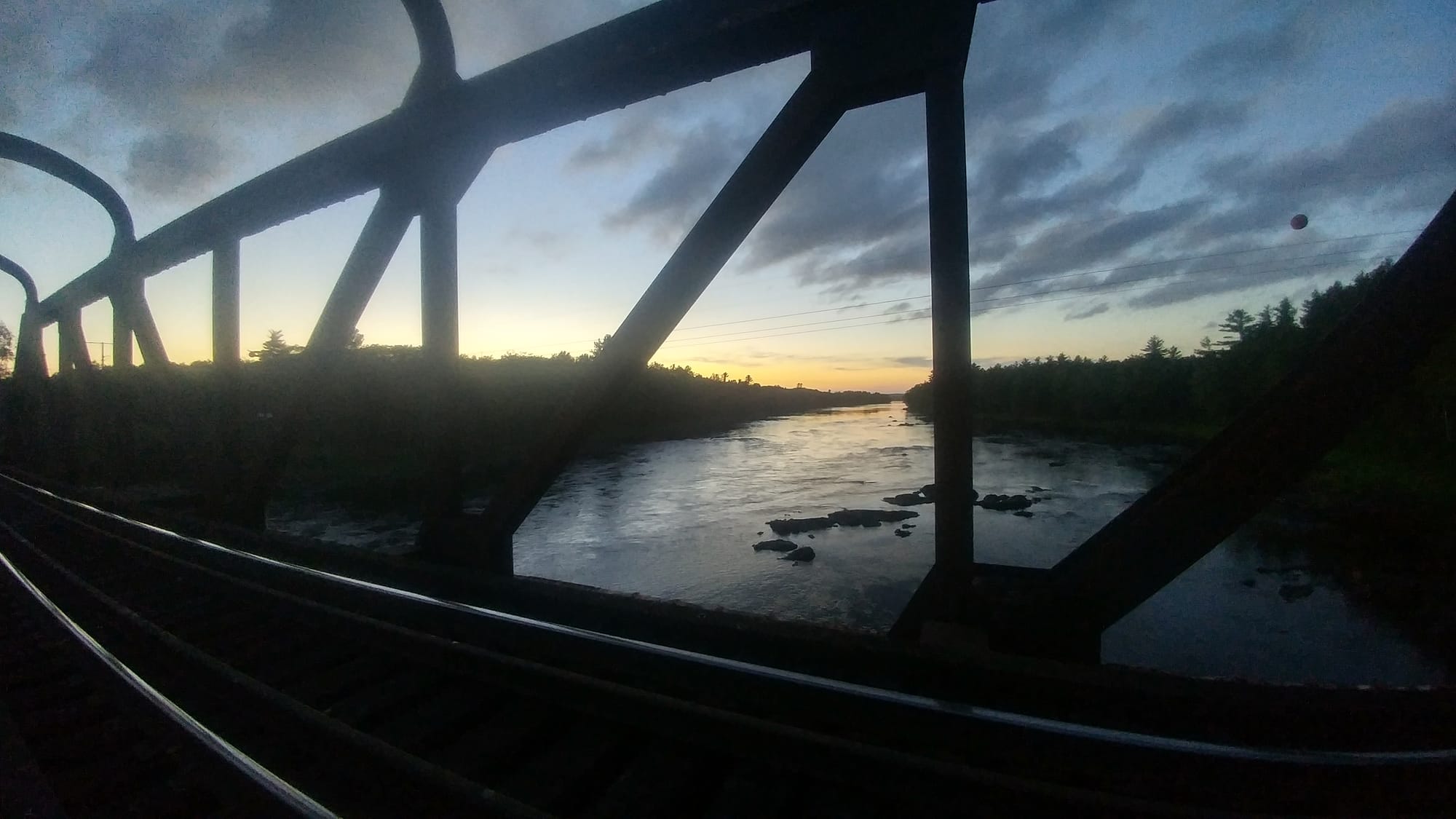 Frogs croaked. Crickets chirped. Mosquitoes swarmed me like a hive of bees, piercing my forearms with their needle-like fangs. I succumbed to their pestilence, and as I reached the train bridge before the Mattawamkeag Yard, the sky lit up orange, bowing across the horizon behind the silhouette of boscage with a river flowing through it. It looked like a cracked puzzle of ice wafers from the skewed lighting of sky, but instead of the water, my eyes caught the glint of steel tracks along the bridge, shining brightly, and I followed them straight to the roadway.