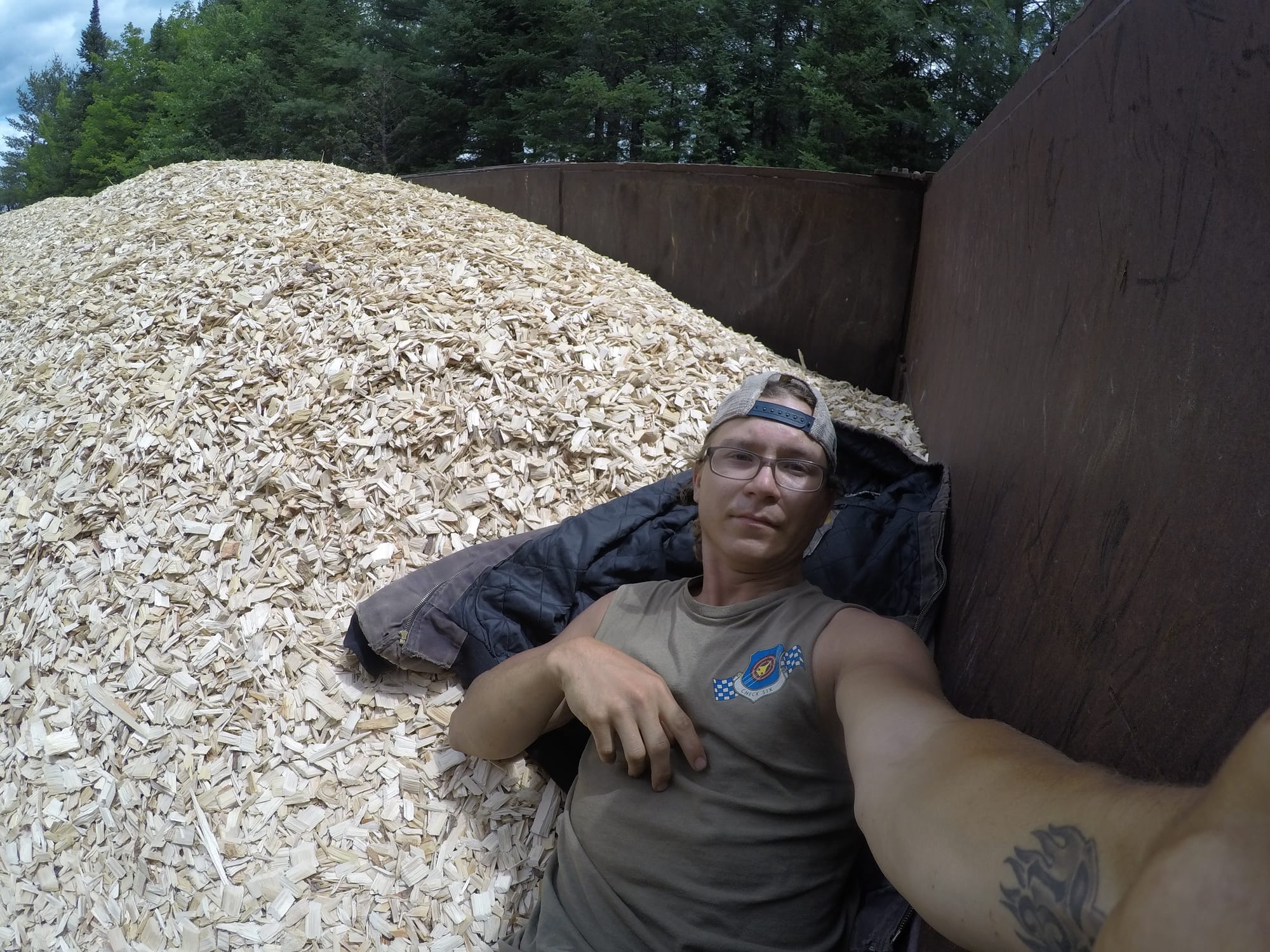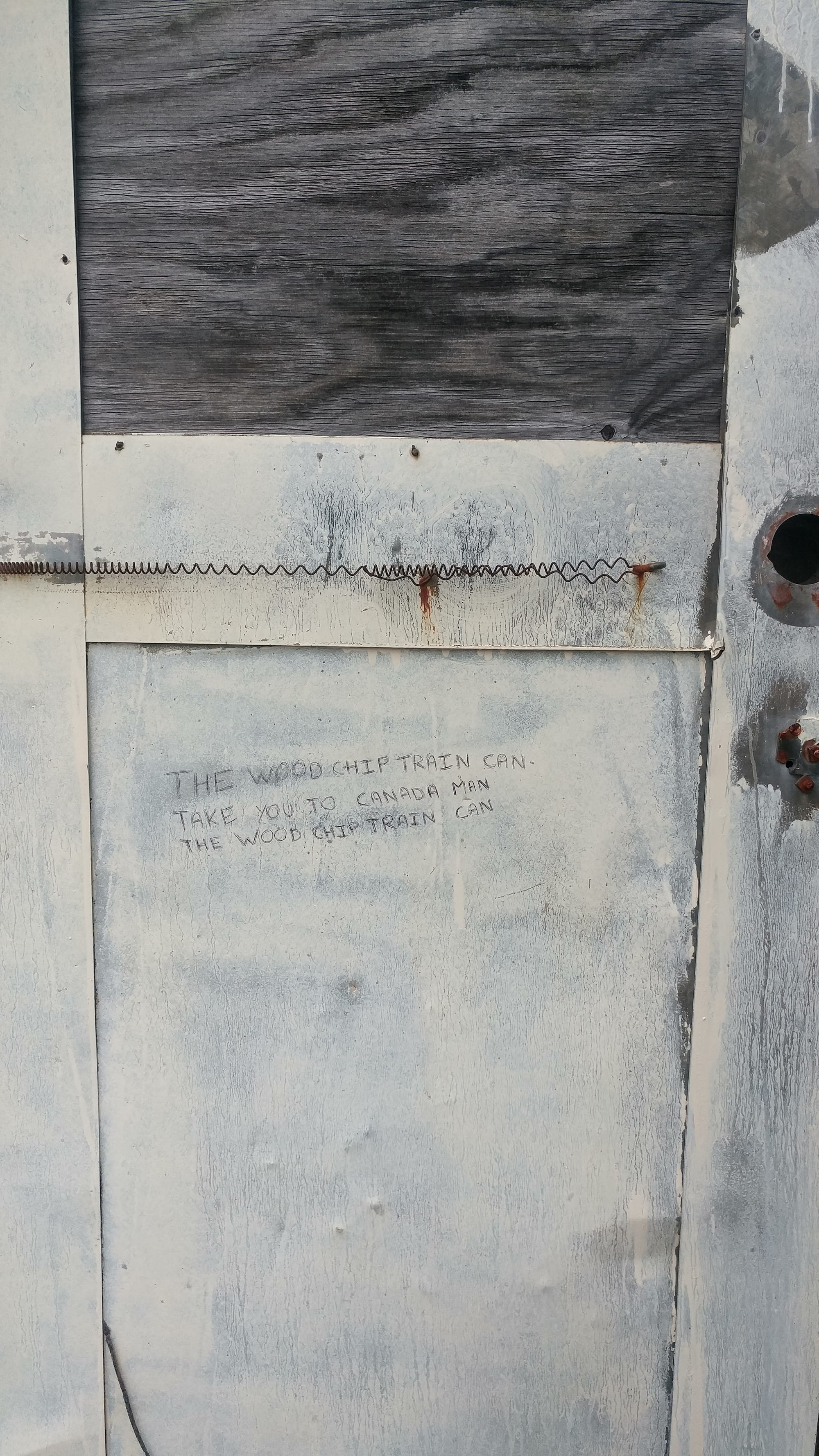 I watched her rear-end roll through the yard out-of-view and I ran. I ran fast. I ran hard. I sweat profusely as my lungs gasped for air and then she halted mid-yard. I stopped. My run whimpered to a scuffling walk and as I scanned her consist I shimmied up the sixth to last car, laying out like a starfish upon her heaps of wood chips, waiting for the sibilance of air to sound off.