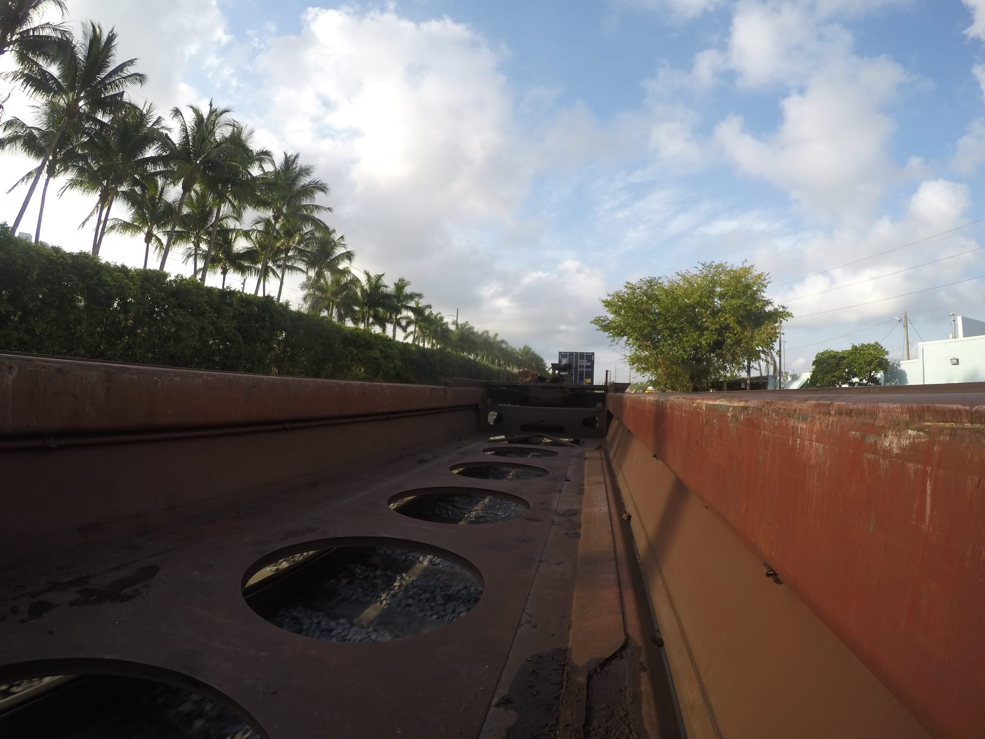 Riding inside of an empty gondola…it looks like a boxcar with the roof chopped off of it. This is a safe ride. You can ride loaded gondolas full of sand and gravel as well, but I would not ride anything where loads can shift, IE. re-bar, I beams, etc…use common sense. It goes a long way.